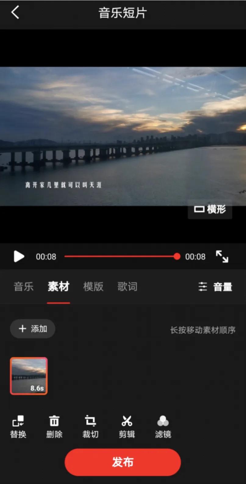 这个功能给小编的第二个惊喜是:“短片”的制作十分简单!友友们只需选中想要的图片、视频素材,再选择喜欢的背景音乐,就能一键生成氛围感满满的音乐短片。友友们可以根据素材情况和发布需求,选择横形、方形或竖屏模式。在“素材”选项中,不仅可以方便地替换和删除素材,还能对素材进行裁切、剪辑、添加滤镜等精细化操作。这对于小编这样的“手残+懒癌患者”来说,真是太友好啦!