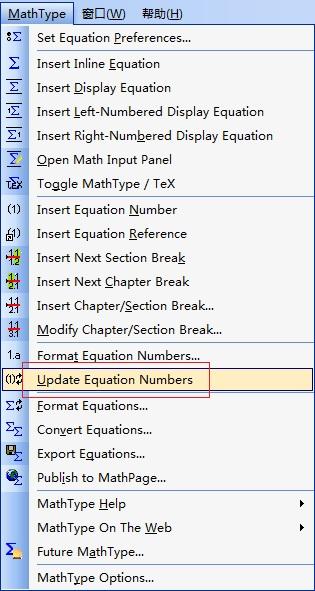 3.回到Word中的MathType菜单中,点击使用“更新公式编号(Updata Equation Numbers)”。