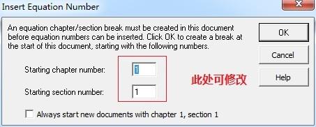提示:如果是第一次插入公式编号,会弹出一个对话,询问是否从以下的序号开始,默认序号是均从1开始,此时你就可以修改你想要开始的序号了。但是这个对话框只会在第一次插入公式编号时出现,此后再插入公式编号就不会再出现此提示了。