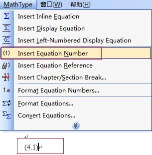4.在Word的公式后面插入公式编号:选择MathType菜单——插入公式编号(Insert Equation Number),就会在公式的后面出现该公式的编号。