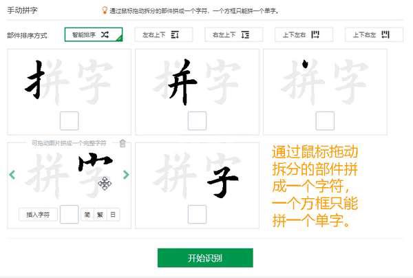 “手动拼字”会自动将图片当中不相连的笔画或部件拆分成多个部件,此时只要拖动图片,将这些部件拼成一个完整的文字。识字体还提供选择拆字顺序功能(包括:“智能排序”、“左右上下”、“上下左右”、“右左上下”、“上下右左”,可以适应“左-右”、“右-左”、“上-下”等不同书写顺序的拆字需求),以及删除部件、移动部件等功能。