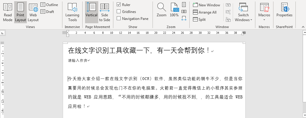 今天给大家介绍一款在线文字识别(OCR)软件,虽然类似功能的软件不少,但是当你需要用的时候总会发现他们不在你的电脑里。火箭君一直觉得微信上的小程序其实参照的就是WEB应用思路,“不用的时候都嫌多,用的时候找不到”的工具最适合WEB应用啦!