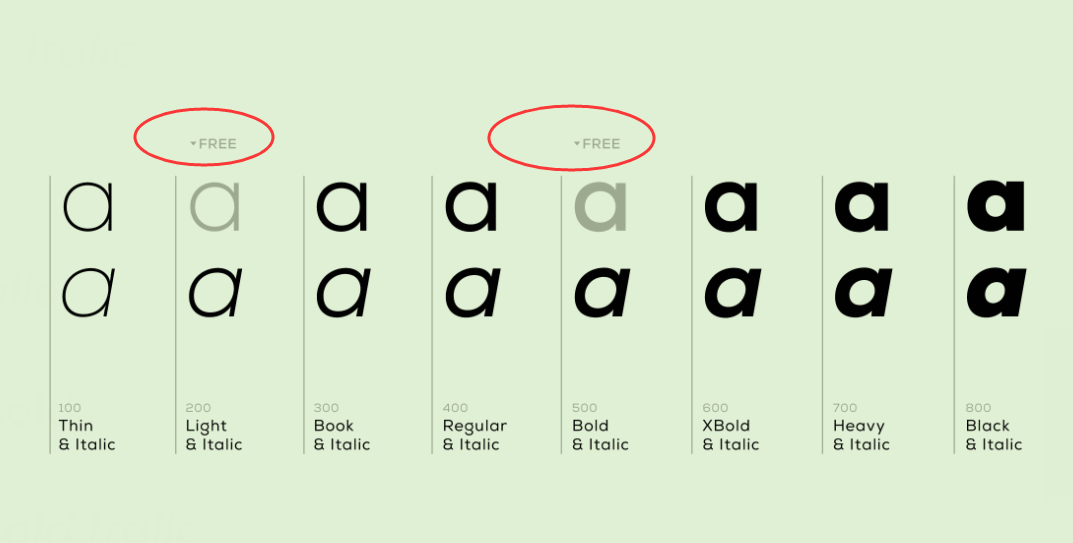 这个字体共有16款样式,其中“light”和“Bold”标识为FREE,虽然很小很轻,但布衣公子还是一眼瞅见它们。