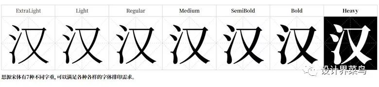 数量: 标准为 7 种粗细字体:ExtraLight、Light、Normal、Regular、Medium、Bold 和 Heavy