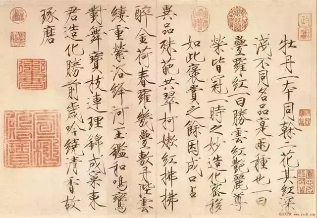 释文:牡丹一本,同干二花,其红深浅不同。名品实两种也,一曰叠罗红,一曰胜云红。艳丽尊荣,皆冠一时之妙,造化密移如此,褒赏之余因成口占。异品殊葩共翠柯,嫩红拂拂醉金荷。春罗几叠敷丹陛,云缕重萦浴绛河。玉鉴和鸣鸾对舞,宝枝连理锦成窠。东君造化胜前岁,吟绕清香故琢磨。