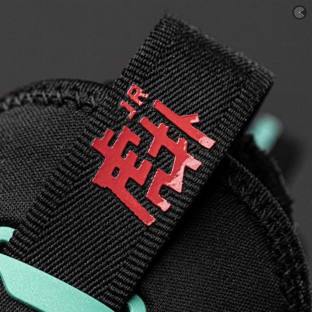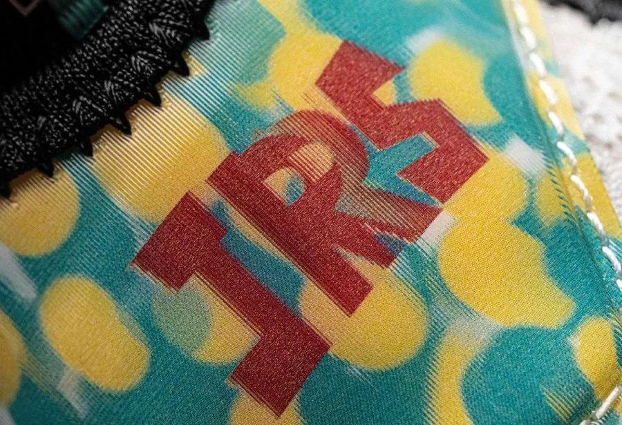 鞋身侧面标志性的虎牙 TPU 采用绿色和金黄色的炫彩设计,同样有夜光效果。