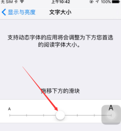 4.在苹果手机字体大小界面里可以看到有个滑块,移动滑块可以调整文字大小,如下图所示。