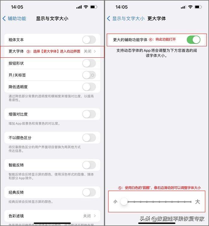 步骤2:进入【显示与文字大小】后点击【更大字体】,进去以后把【更大的辅助功能字体】打开即可通过下方滑动来调节字体的大小。