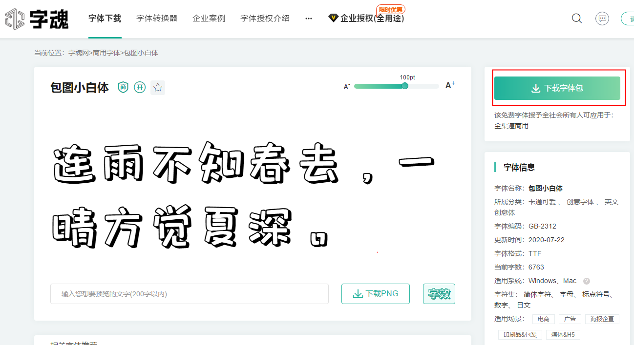 每一款字体都有标明是否需要商用,找到可以免费商用的字体后进入,就可以直接把字体包轻松进行下载哦!