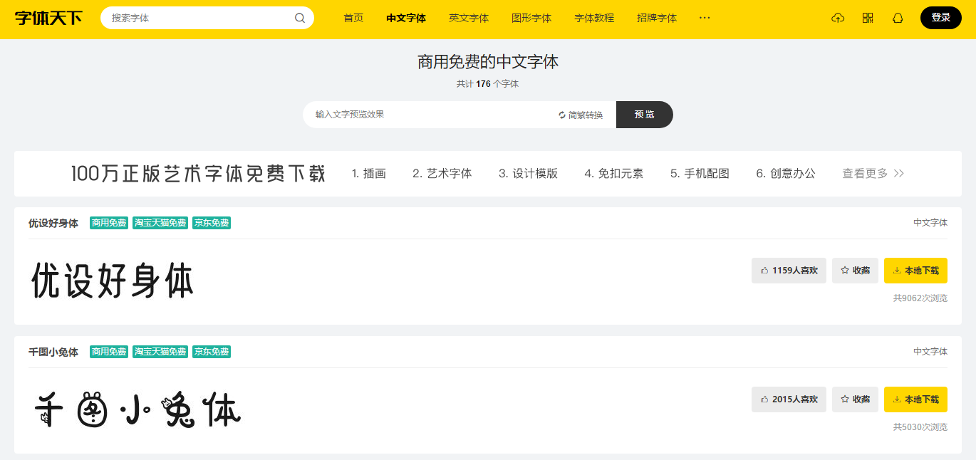 一个中英文字体网站,字体种类很丰富,可以预览到字体的效果,同样部分字体是付费才可以商用的,但是免费字体的数量也是够用的啦。