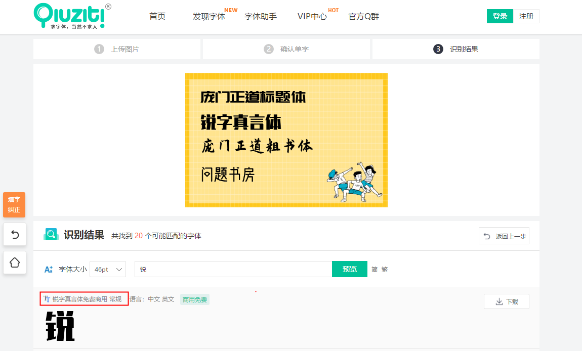 我们试下用前面的图片来识别,识别可以自己勾选需要的字体,出来后就可以看到字体的名称,也可以看到是否可商用哦!