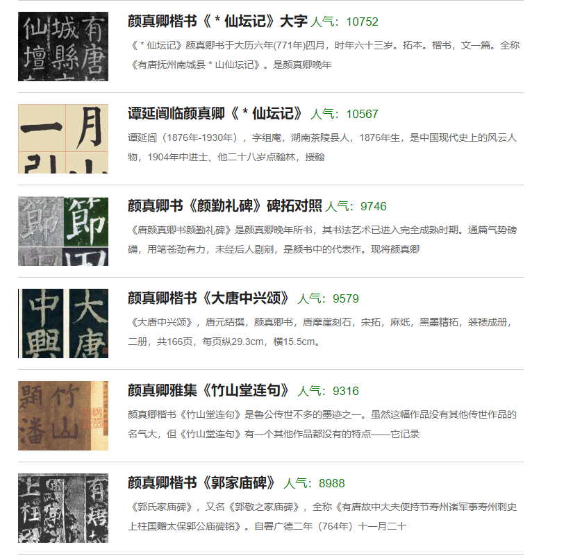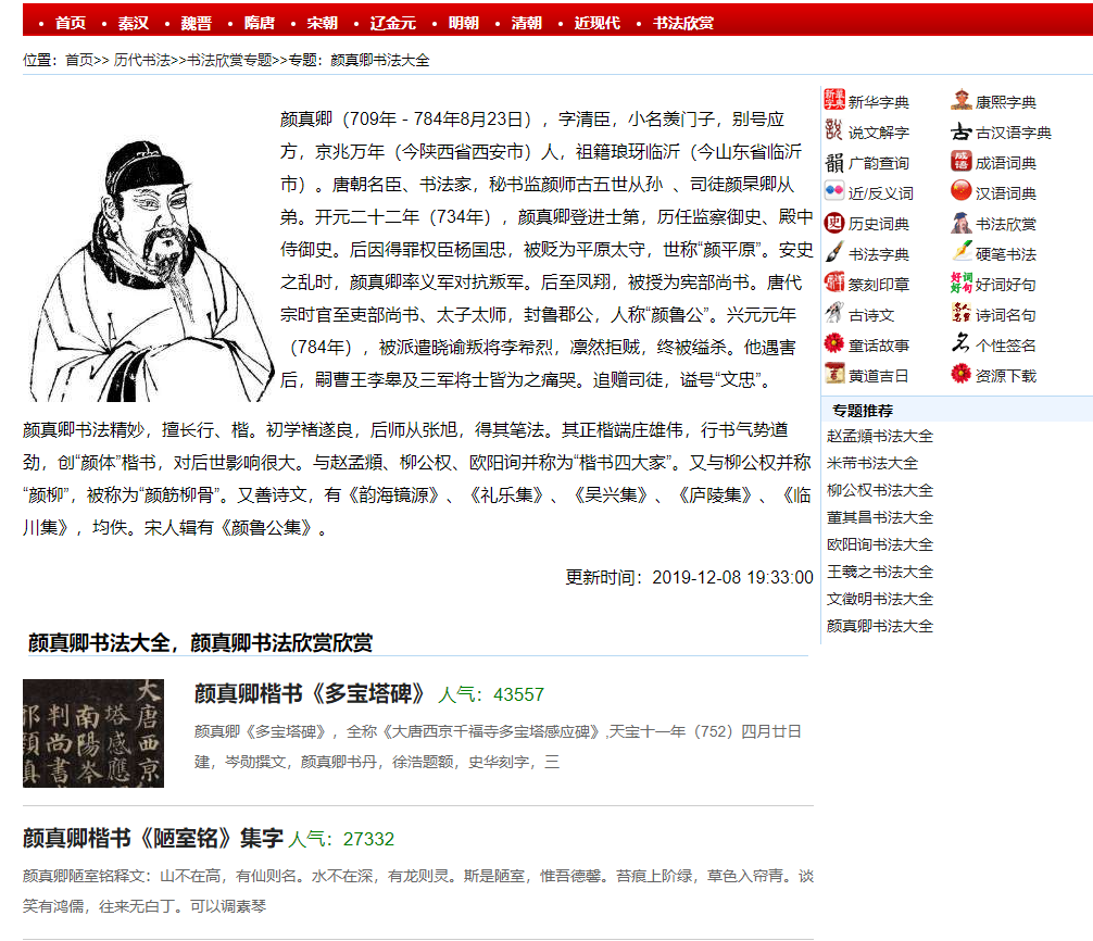 比如,我们选择一位书法家,就比如颜真卿大师,那么你点击进去,你会看到很详细的关于大师的生平和字帖