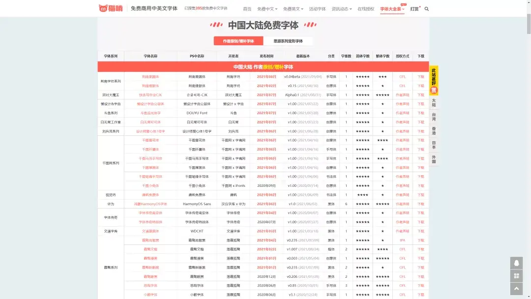 这是一个免费字体收集网站,目前收录 395 款中文字体,以及 87 款英文字体,非常的全面: