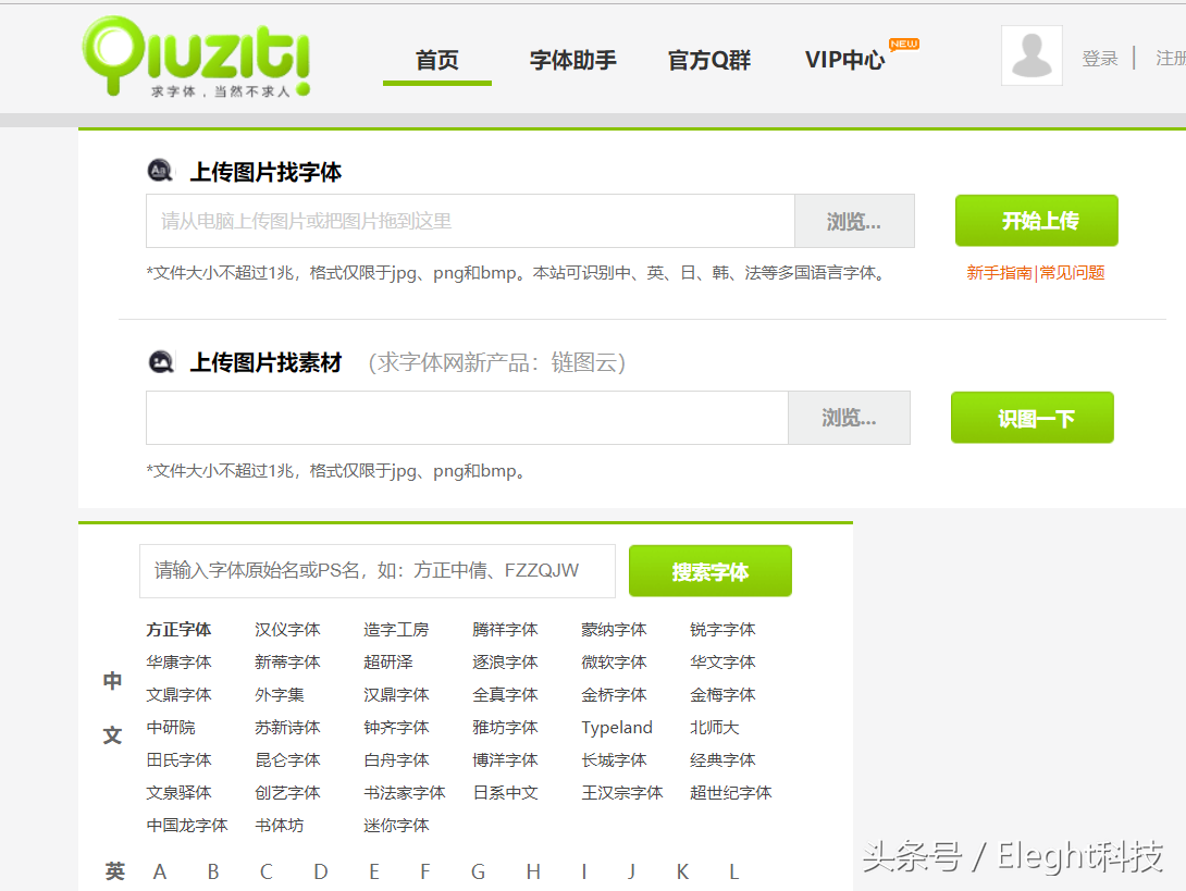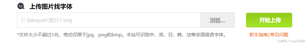 在这里有两个选项,一个是上传图片找字体,一个是上传图片找素材,我们选择第一个上传我们刚刚保存的图片,图片大小不能超过1M,格式仅限于jpg、png和bmp。可识别中、英、日、韩、法等多国语言字体