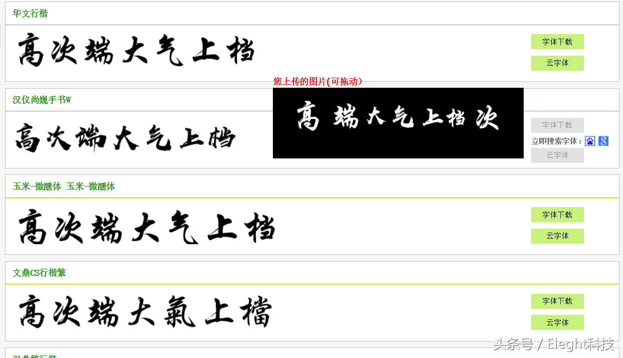 看完后我就很清楚了,原来使用了华文行楷的“高”字,汉仪尚巍手书W的“大气”两个字,识别率真的是非常的高,只要你的字体不是很特别最近新出的,大家喜欢哪些手机电脑字体都可以使用这个方法找到,字体的右边可以下载到,如果出现不能下载的字体可能涉及版权的问题,因为有一些字体是需要版权授权的,大家还可以试试上传图片找素材这个功能,因为有些好看的字体可能还是图片作者自己写的几个字。