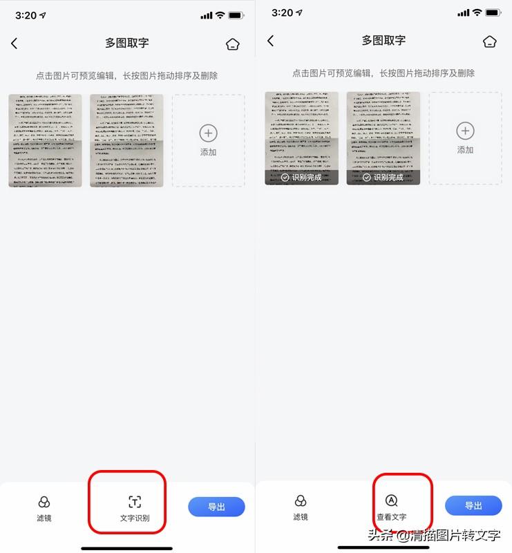 在多图取字页面,我们有两个选择:一是直接将拍摄好的图片,点击右下角的导出,保存为PDF格式上传至电脑,借助嗨格式PDF转换器,将PDF转换成Word文档保存。二是使用底部的文字识别功能,将照片转换成文字。选择了第二个方法的小伙伴们,可以在识别完成后,点击查看文字。