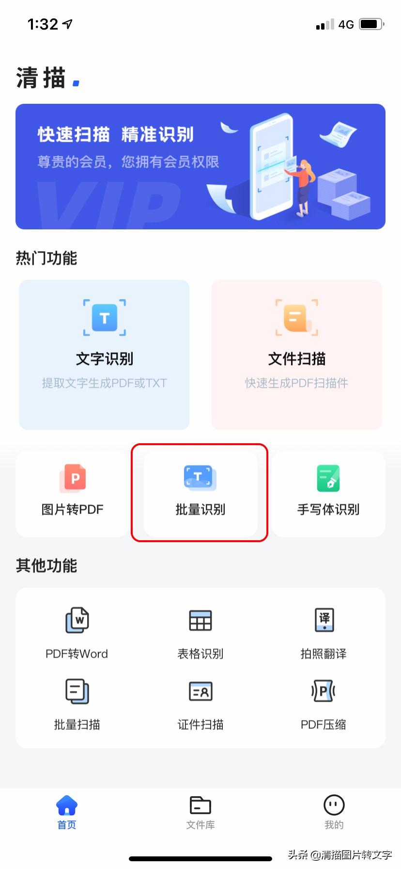 打开手机上的清描APP,在软件的主界面选择【批量识别】,这个功能适用于文档页数较多的情况。