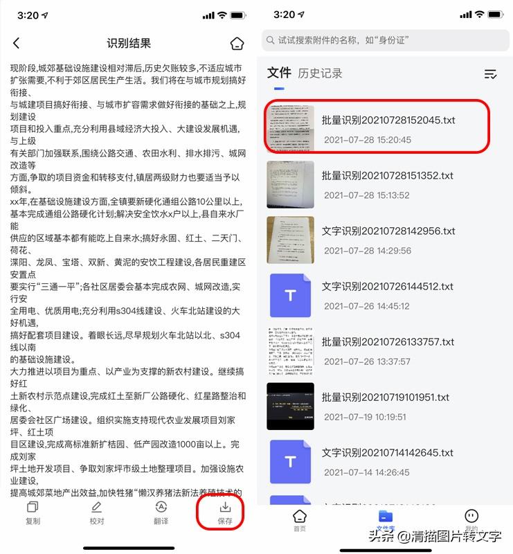最后,点击右下角的保存按钮,文件支持保存为PDF、DOCX和TXT格式,我们选择TXT。识别出来的文字,在软件的文件库中就可以找到了。