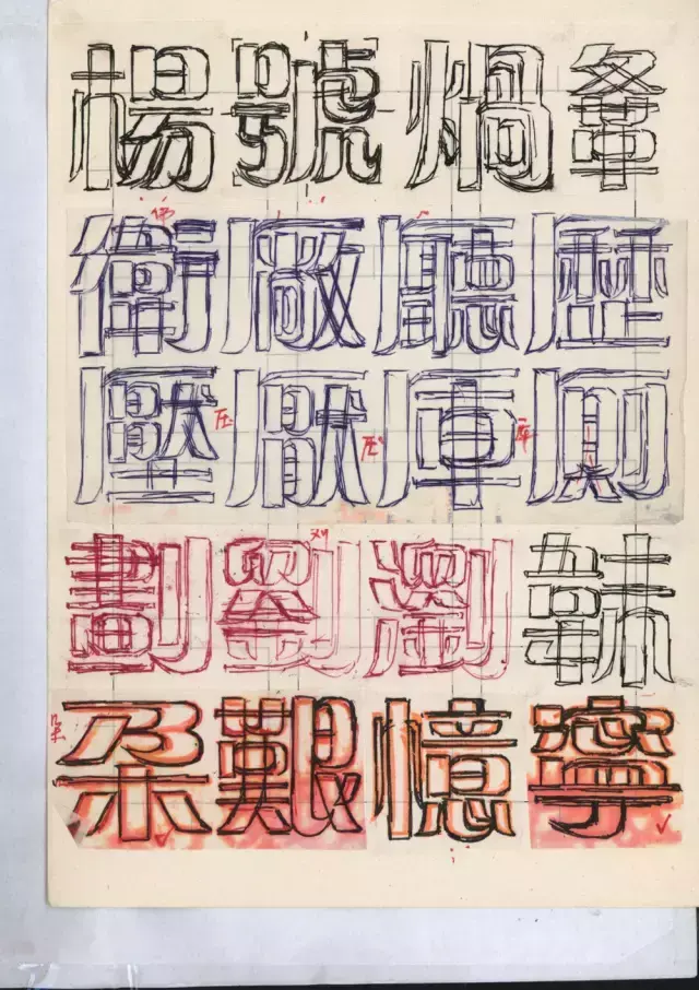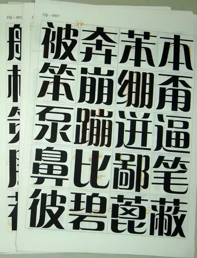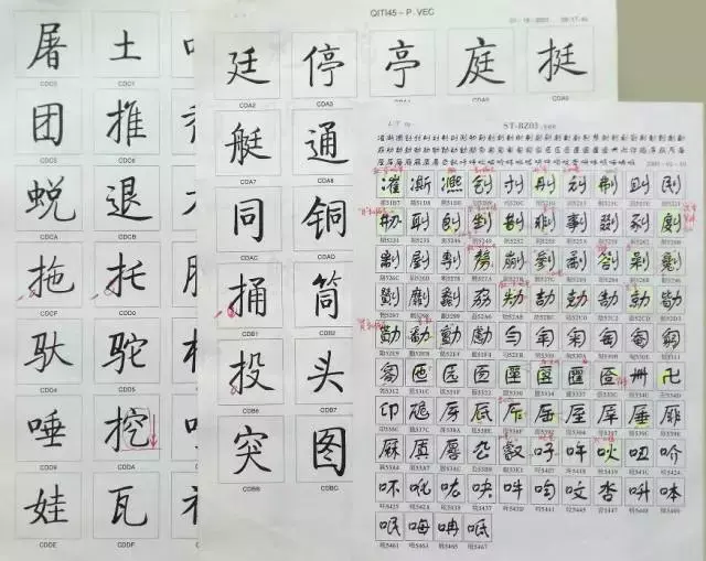 除了设计师一个字、一个字地自查外,还会打印出纸样,由主创设计师对每个字形的结构、笔形、粗细提出修改意见,包括检查字形轮廓是否光滑、结构是否合理、粗细是否均匀、灰度是否和谐、整体是否美观,反复修改,直到满意为止。