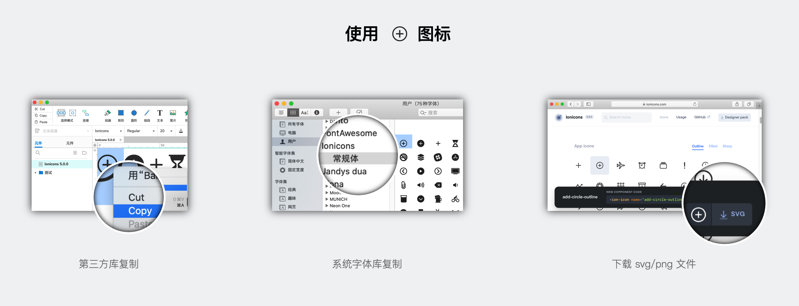办法 1:从其他的图标字体库中直接复制粘贴;办法 2:从系统字体中复制粘贴;办法 3:导出该字体图标的 svg/png 图片文件,再复制粘贴。尽管这三种方式都能满足正常使用的需求,但对应的也会存在三个问题: