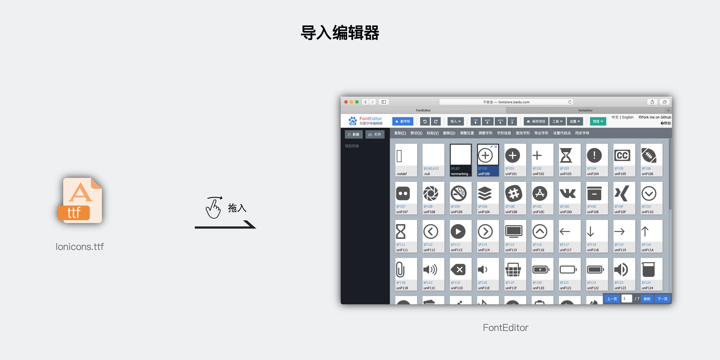 首先可以在 Ionicons 官网下载字体 TTF 格式字体文件。下载完成后,打开百度字体编辑器 FontEditor ,直接将刚才下载的 TTF 文件拖入编辑窗口。