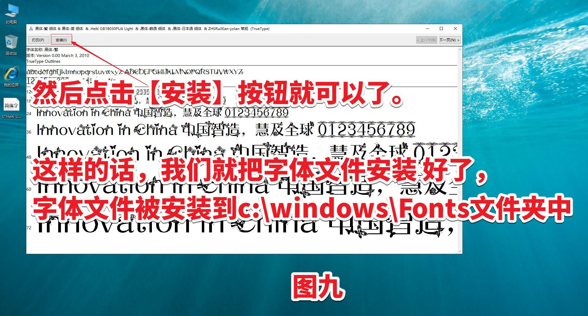 然后点击【安装】按钮就可以了,这样的话,我们就把字体文件安装好了,字体文件被安装到C:\windows\Fonts文件夹中了,大家如果有什么问题的话,可以给我留言。
