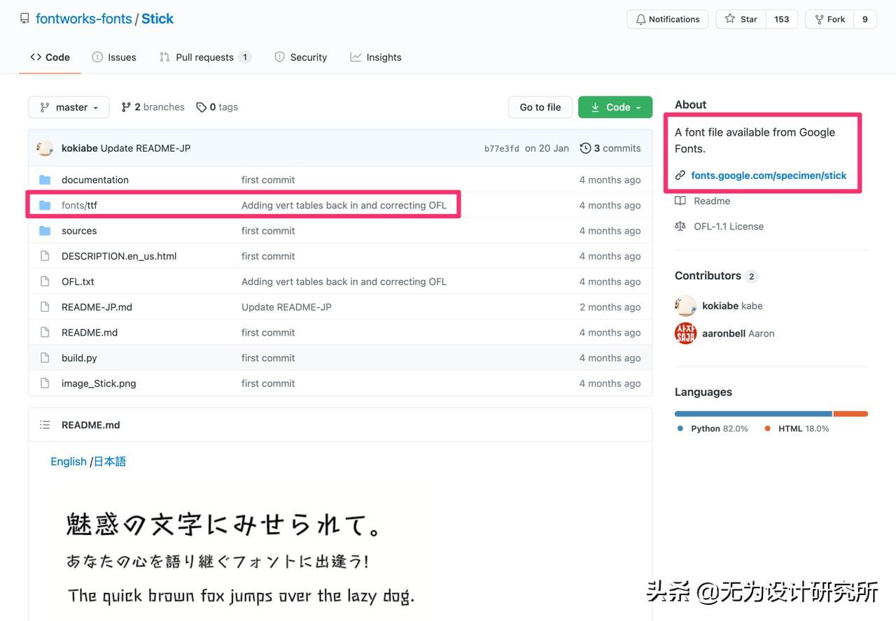 点选进入字型页面,如果该字型有出现在 Google Fonts 会在右上角显示链接(除了 Rampart 和 Klee 没有以外其他都有),下方也会有预览图、字型介绍、下载链接和授权方式,要如何取得字型档呢?点选上方「fonts/ttf」资料夹。
