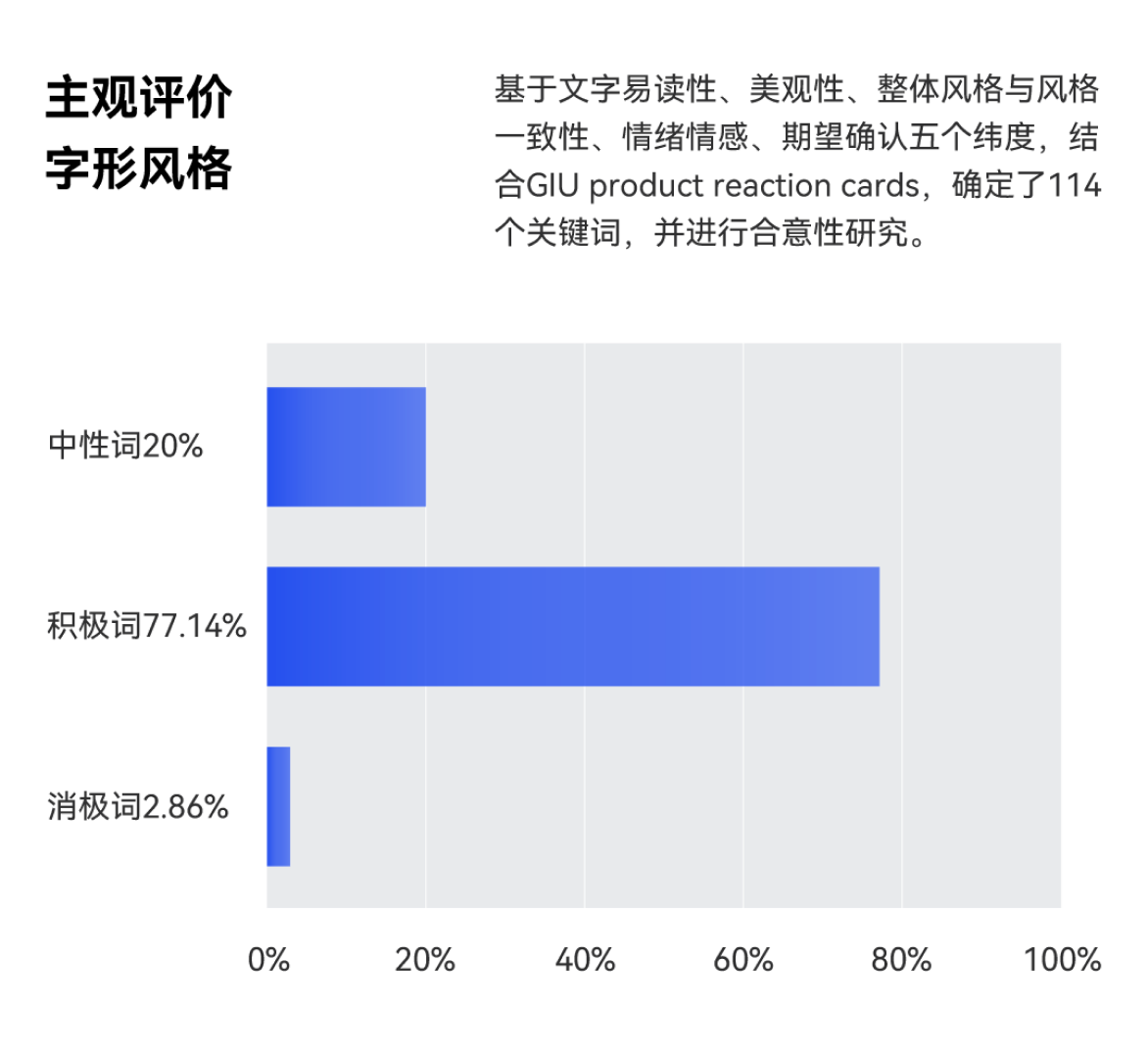 华为用户针对字形风格评价显示,用户评价高频词汇为:清晰的、中性的、优雅的、自然的、好看的、舒适的。用户对新字体的好感度高于旧字体,且感知到了字体笔画的优化,如削弱了黑体的机械感等。