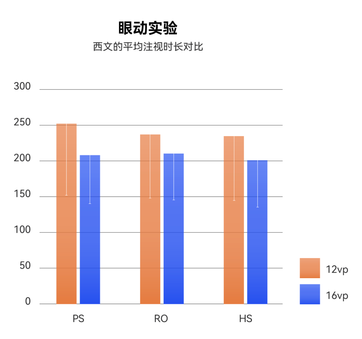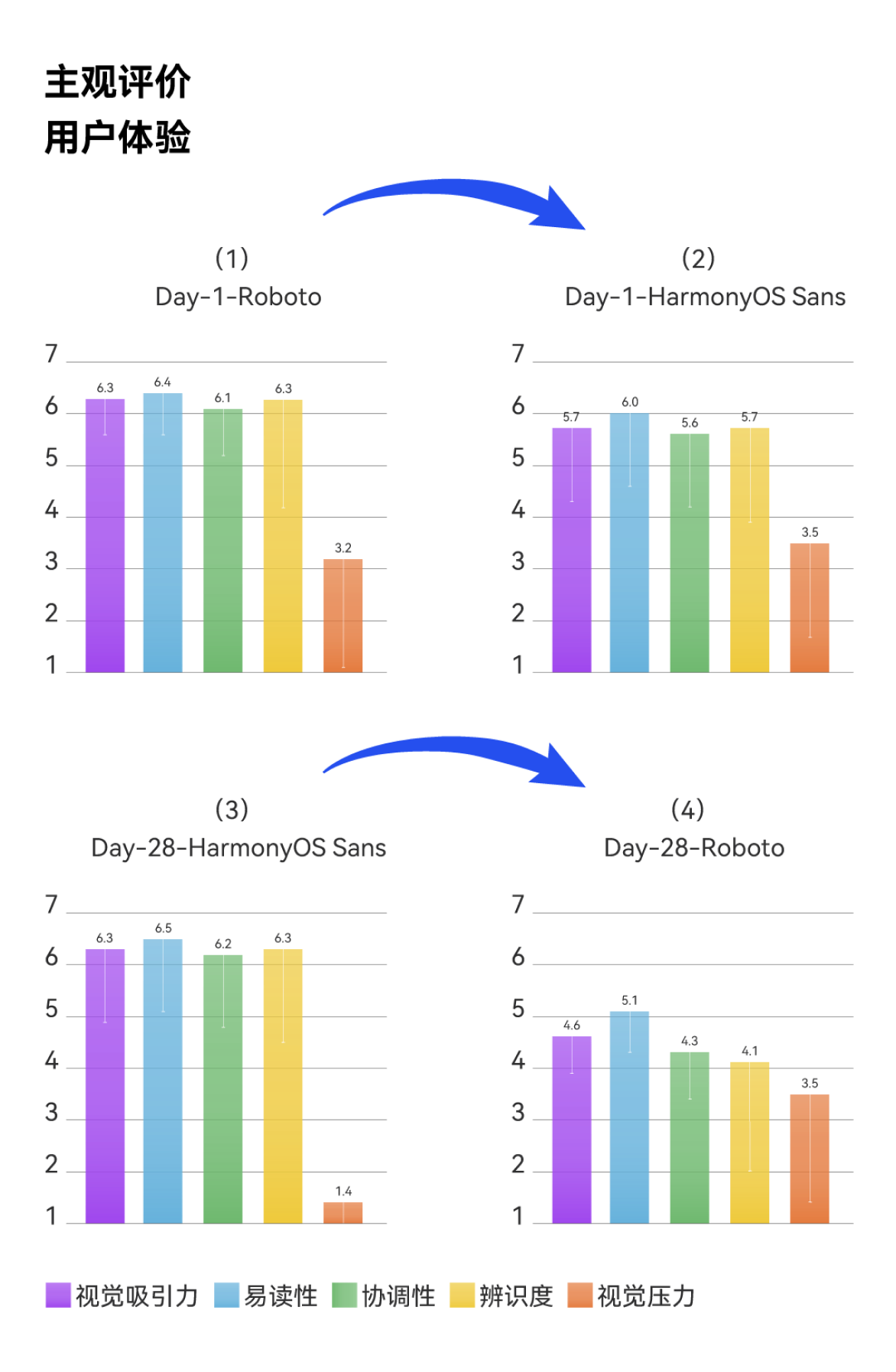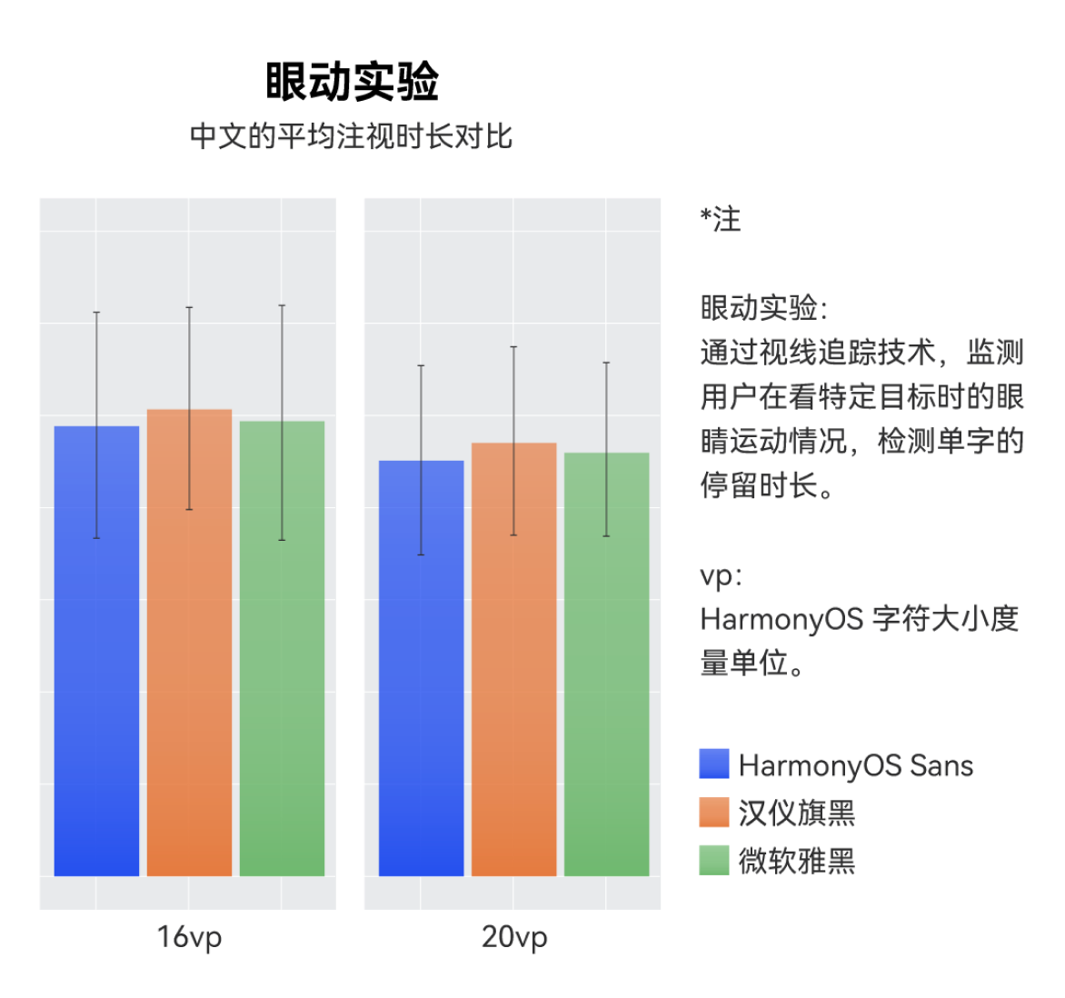 西文与Product Sans、Roboto进行对比,新字体平均注视时间均低于其他字体。由此,HarmonyOS Sans 中西文的易读性均得到了印证。