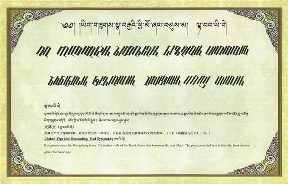 藏文书法的起源3000多年以前,藏族的先民就已经开始使用石器在山崖上做符号记录事情。这种最早的记号就是藏族最早的文字。称为达斯本益(意思是象形文)。公元6世纪时,苯波教盛行时期,藏区出现了简单的大玛尔文和小玛尔文。