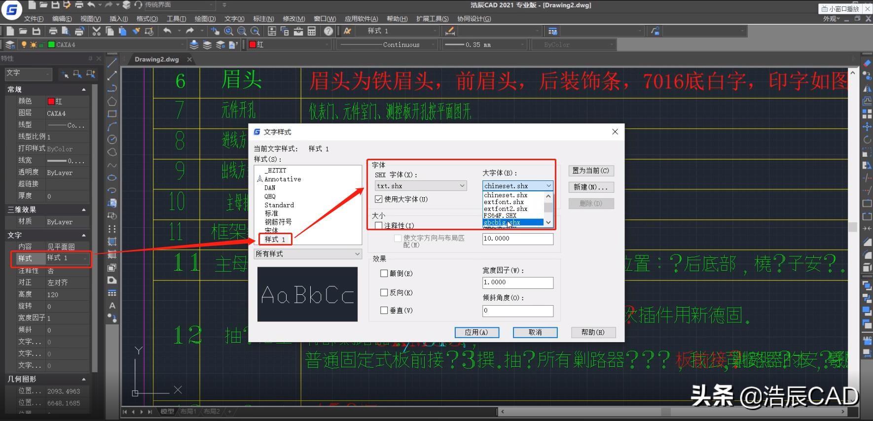 第四步:下拉字体选项栏,可以将SHX字体更换为txt.shx字体,将大字体更换为gbcbig.shx字体,点击「应用」即可,如视频所示。当然,少数偏僻字体可能无法更换成功,此时可参照方法2。