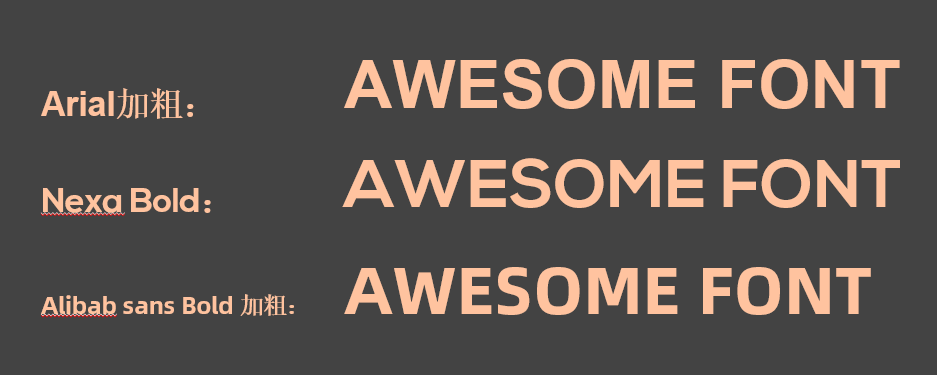 如此,基本上可以判断这个“Nexa light”和“Nexa Bold”是可免费商用的了。那么,它的呈现效果如何呢?如下图,是Arial加粗、阿里巴巴普惠体中的西文字体Bold并加粗,及Nexa Bold未加粗默认样式,大家对比看下: