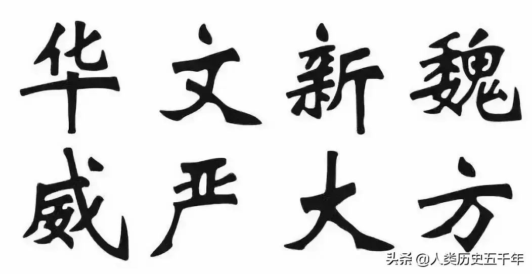 新魏体 兴起于上世纪五十年代,流行于文革时期。所谓新魏体,顾名思义是相对老魏体而言,其脱胎于魏碑,又明显不同于魏碑,是一种在魏碑基础上加以改造创新的楷书字体。新魏体主要选取《张猛龙碑》、《始平公造像记》、北魏墓志这一路方正刚硬、雄峻强健的魏碑,同时杂以清代张裕钊、赵之谦的魏碑楷法,取其方硬之势。更重要的是,由于受到特定历史风潮和政治运动的影响,新魏体大多选取简体字,且用美术字的手法解构魏碑,归纳笔画,重塑字形,放大字体,使其标准化、程式化。
