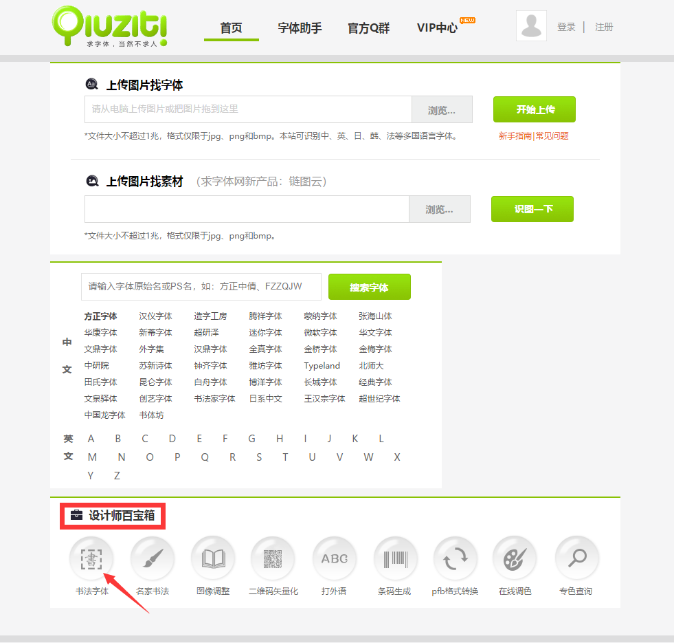 接下来我们来说一下如何生成书法字体,在首页上找到设计师百宝箱里的书法字体