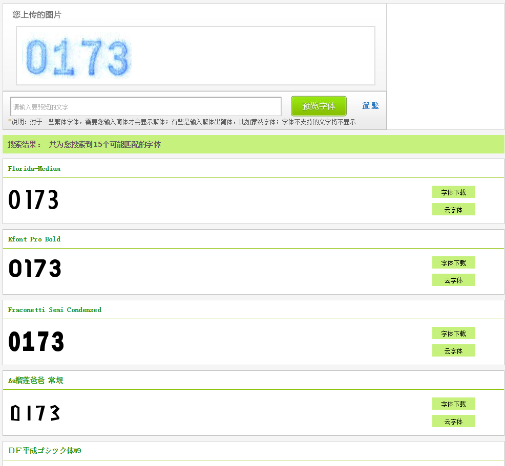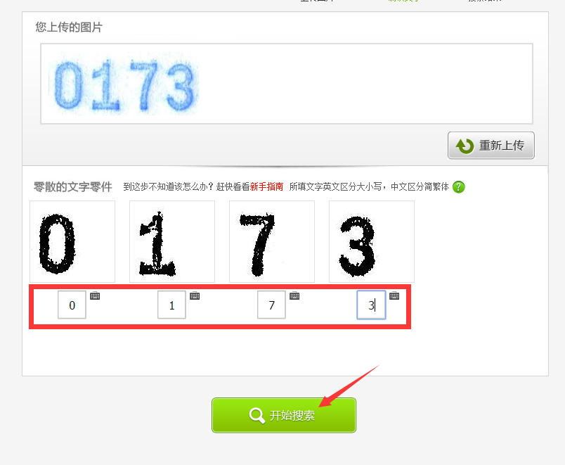 上传完成后,会出现字体识别界面。根据识别出图片上字体,填入相应的文字,然后开始搜索