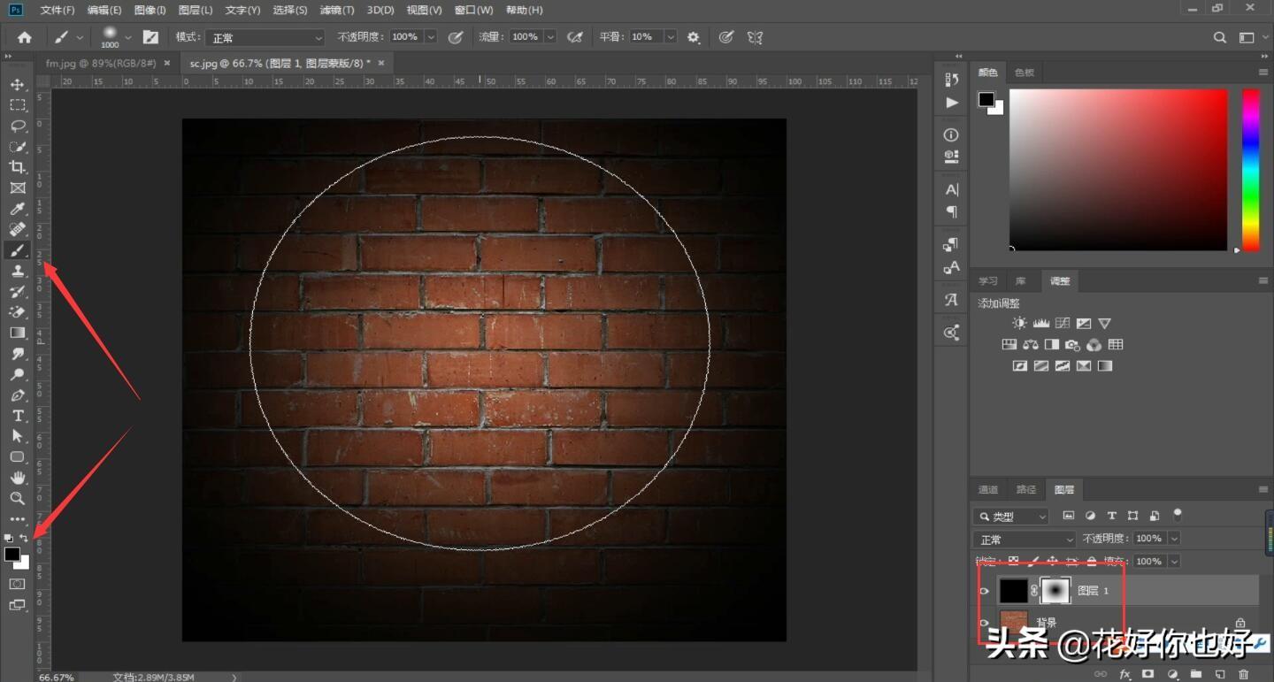2.给图层一添加一个图层蒙版 ,使用画笔工具 ,前景色为黑色,柔边圆笔触,在画布中央单击一下