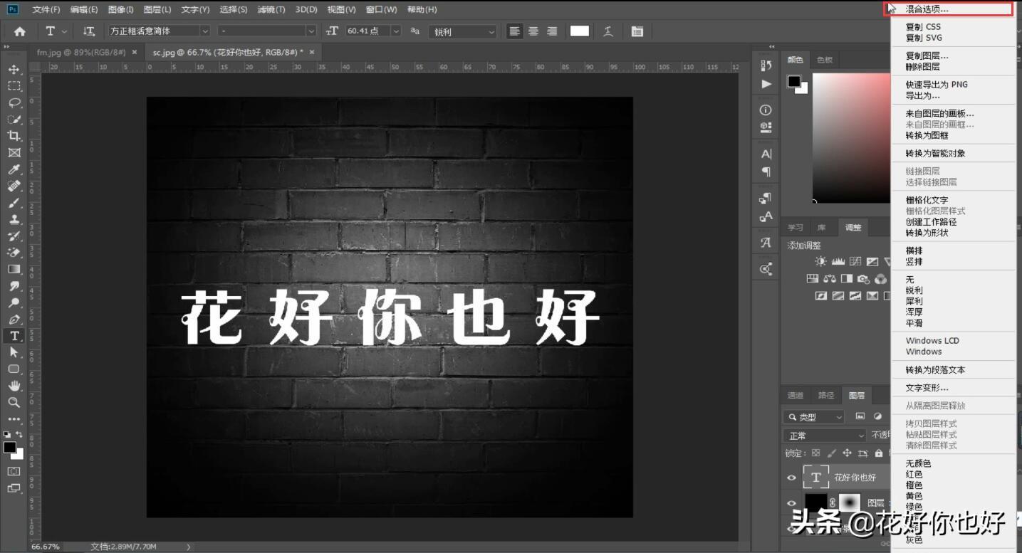 4.使用文字工具 ,在画布的中央敲打出我们需要的文字,设置好字体大小以及位置,然后右击文字层,选择混合选项