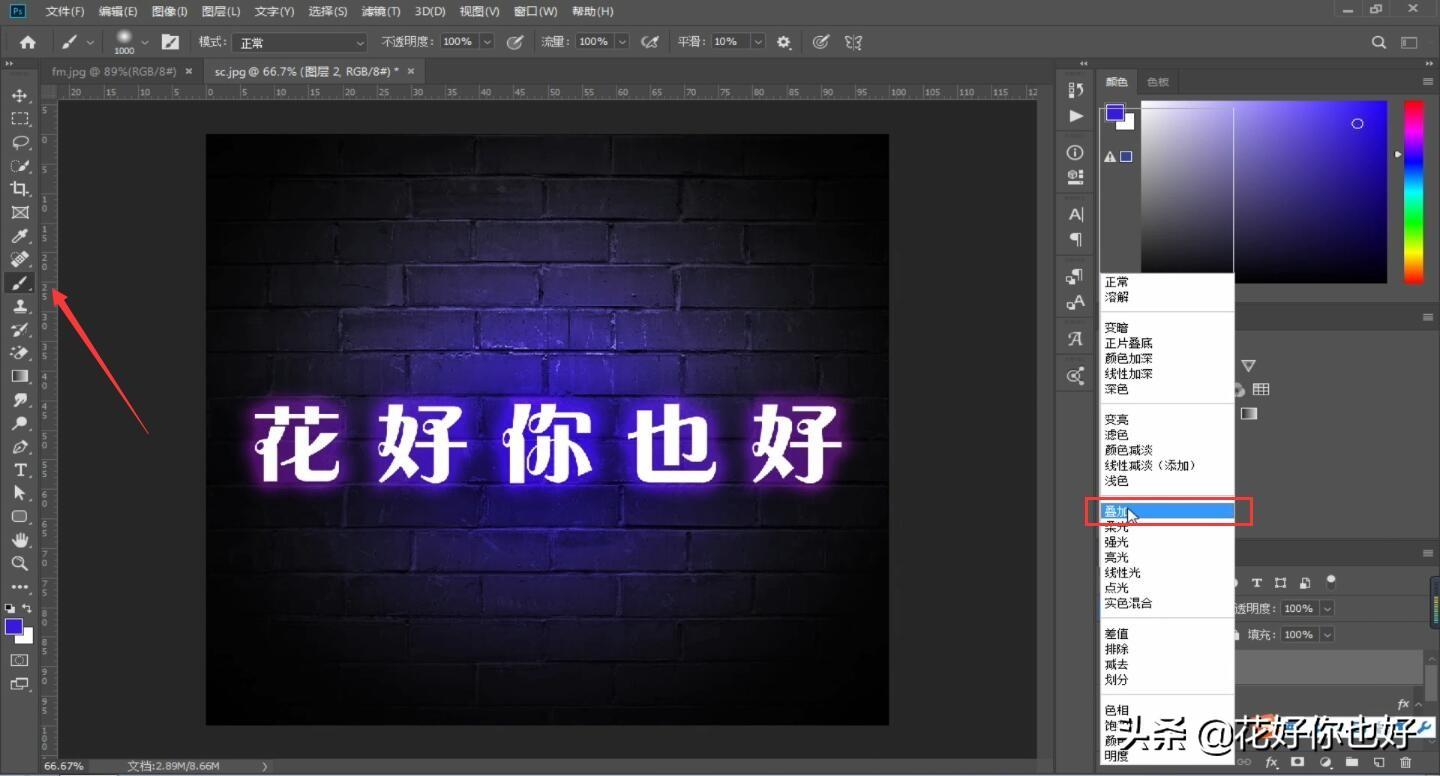 7.新建一个空白图层,打开拾色器,选择其他一种颜色(霓虹灯色,教程为蓝色),使用画笔工具在画布中央单击一下作为填充,并将混合模式设置为叠加 模式