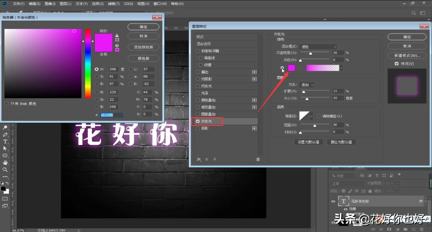 5.给文字添加一个外发光 效果,设置一个外发光(霓虹灯的颜色)的颜色,调整合适的扩展以及大小值
