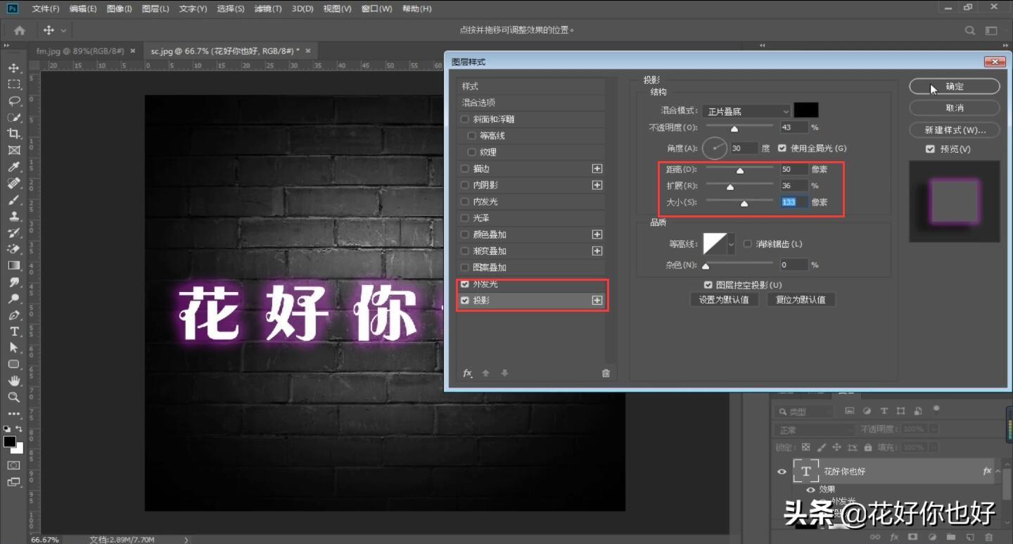 6.给文字添加一个投影 的效果,调整合适的距离和扩展以及大小值