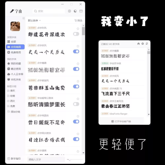 应用字体流畅方便,官网客户端云同步。无论是打开软件、应用字体还是预览收藏,都非常流畅。应用一款字体,只要打开右侧的开关,就能一步到位直接应用,切换字体超方便!在保持客户端运行的状态下,就可以直接在官网浏览字体,看图找字,体验更畅快,而且字体案例还提供不同字体的应用场景,看起来更直观。在官网看到合适的字体后,不用下载安装,只需要打开开关,就可以一键同步,客户端也会同步激活。