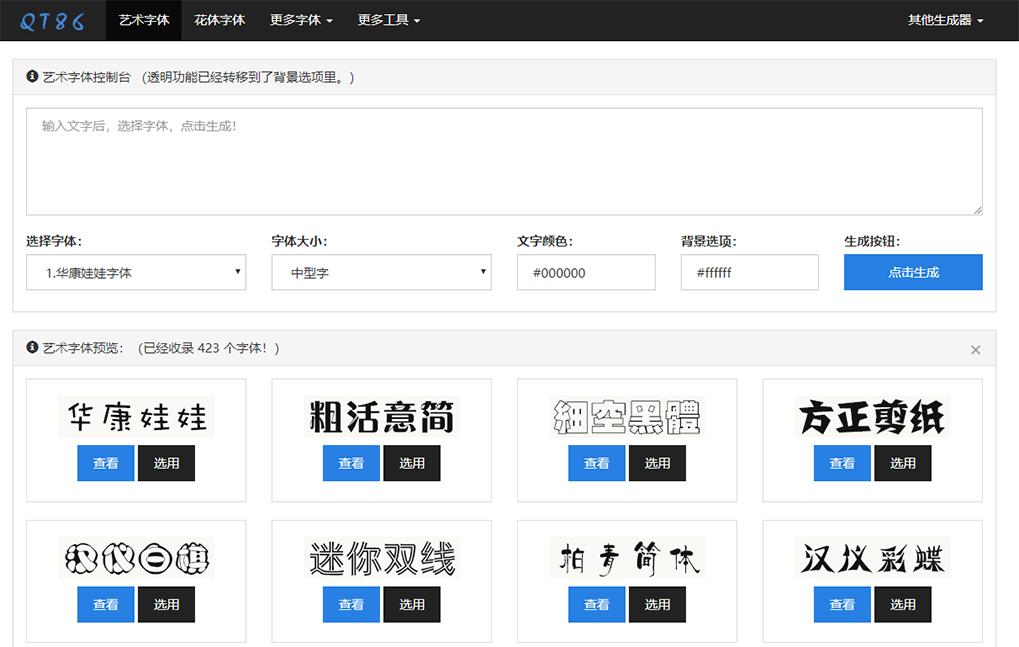 QT86(http://www.qt86.com/)最初是为了提供黑板报字体参考而创造,现在已经成为互联网世界最流行的艺术字体在线生成器工具网站之一。在QT86网站首页,我们可以查看到丰富的艺术字体,单击"选用"按钮可进入字体生成页面,如图所示。