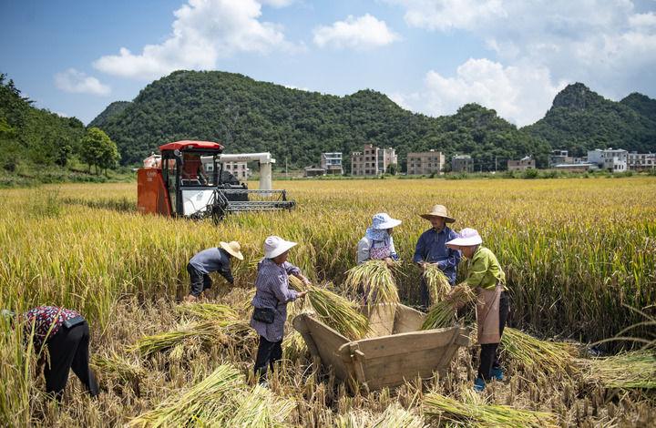 在云南省文山壮族苗族自治州广南县八宝镇坡现村,村民在收割稻谷(2024年9月7日摄)。新华社发(熊平祥摄)