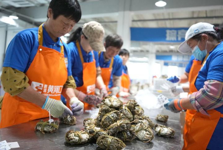 山东省东营市垦利区的一处大闸蟹加工车间的工作人员对新鲜的大闸蟹进行分选和捆扎(2024年9月10日摄)。新华社记者 徐速绘 摄