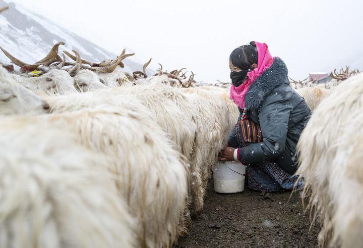 在西藏阿里地区日土县龙门卡村白绒山羊扩繁场,饲养员在给白绒山羊挤奶(2024年9月13日摄)。新华社记者 孙瑞博 摄