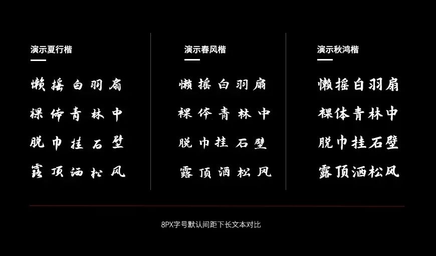 同样作为楷体,「演示夏行楷」的字形较小、间距稍调大,更好地展现出舒展延伸的字体特点。