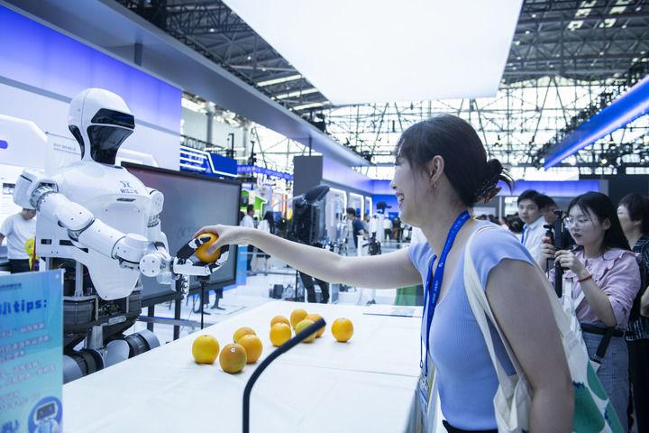 “小江,请递给我一个橙子。”接到指令后,名叫“小江”的人形机器人左右“手”接力,拿起、递出等动作轻松连贯,顺利完成任务。不远处,另一个人形机器人“万小特”手舞足蹈,也向观众展示自己的“十八般武艺”。