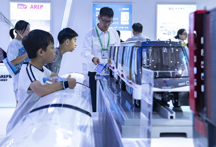 9月21日,在2024世界制造业大会上,小朋友参观体验阿尔斯通跨座式单轨列车。新华社记者 黄博涵 摄