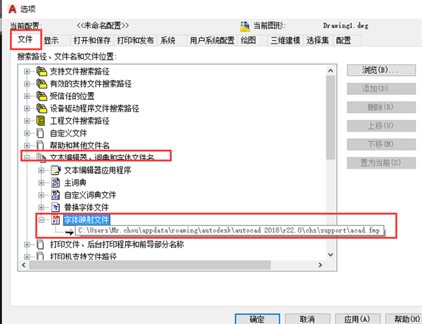 输入命令OP ,打开选项对话框,找到【字体映射文件】,然后把这个地址选中,在用鼠标左键单击一下,复制它 。
