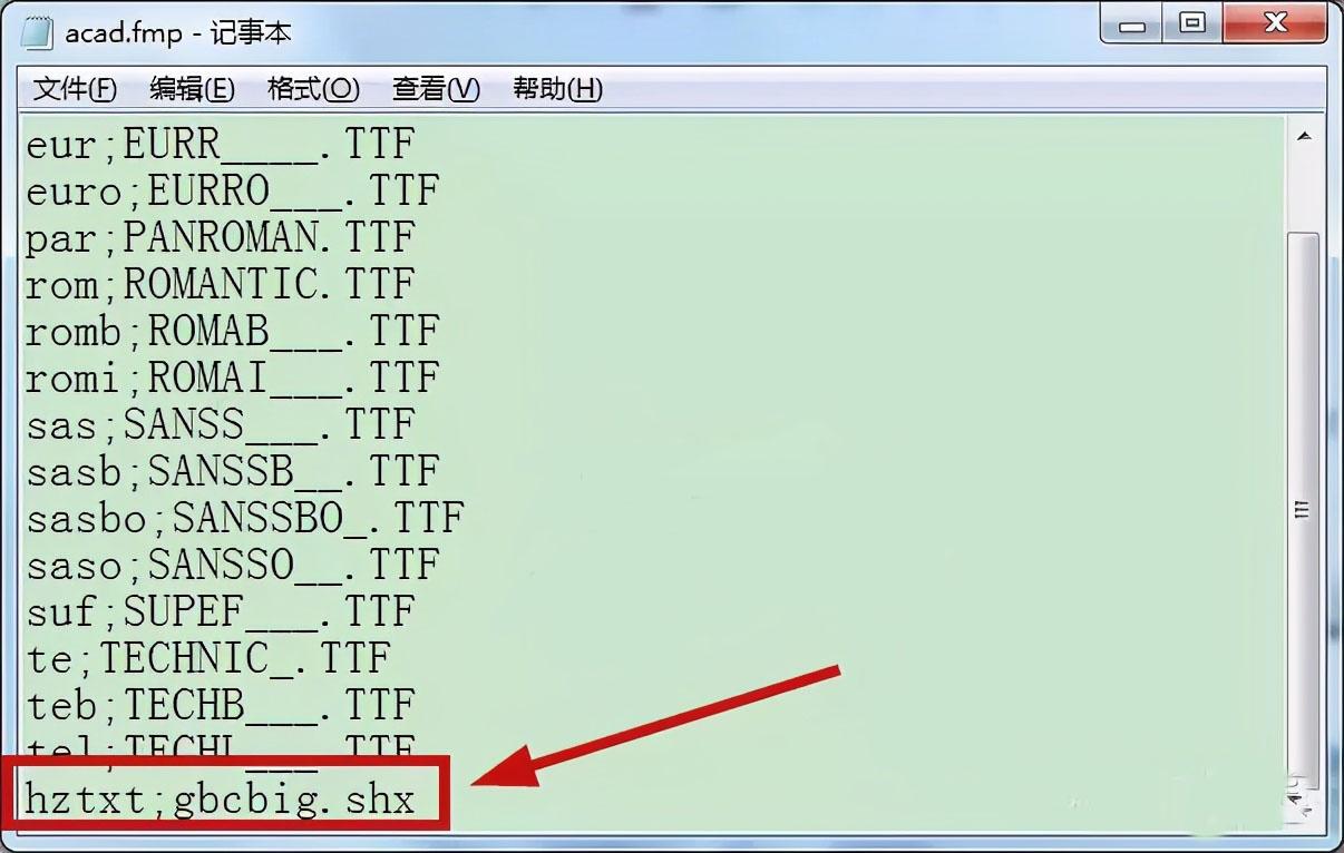 回车打开它,然后在最后面增加一行字符:hztxt;gbcbig.shx